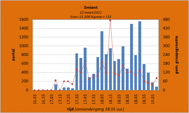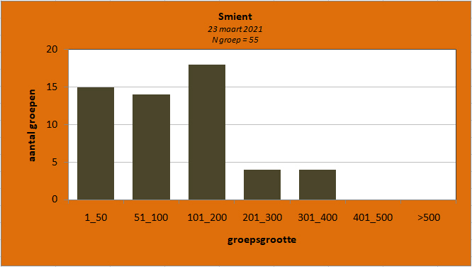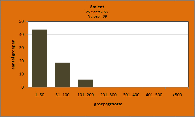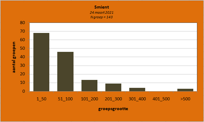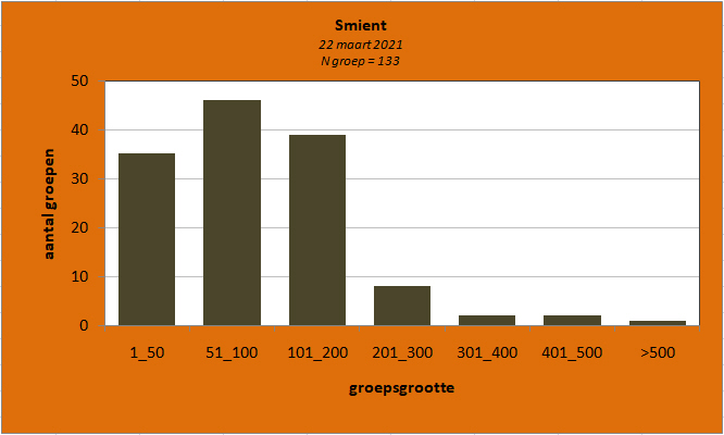 In totaal werden er 15.206 Smienten verdeeld over 133 groepen waargenomen. De kleinste groep bestond uit slechts zes exemplaren, de grootste groep uit 760 exemplaren. In vergelijking met vorig jaar was de gemiddelde groepsgrootte van de wegtrekkende Smienten weer een stuk groter en leek dit dus meer op het beeld van de wegtrek in 2013. Een kwart van alle groepen bestond uit 50 of minder exemplaren en ruim een derde uit 51 tot 100 exemplaren. Grote groepen zijn doorgaans schaarser dan kleine groepen, maar vanavond bestond bijna dertig procent van de groepen uit 101 tot 200 exemplaren. Daarnaast waren er nog dertien groepen van meer dan 200 Smienten.