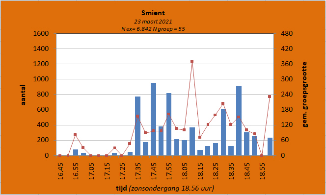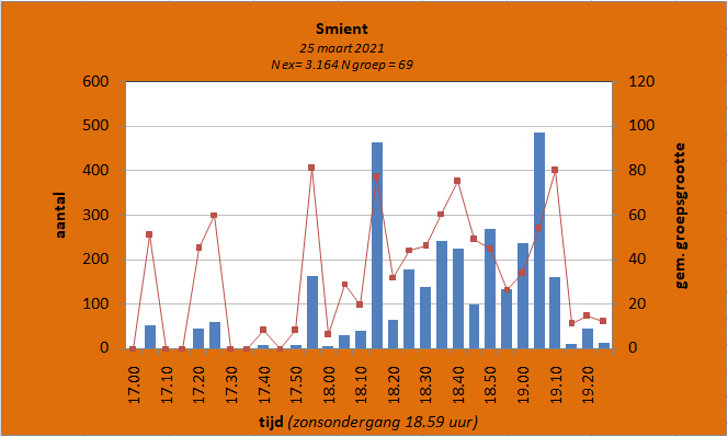 Opvallend is dat de wegtrek vanavond grofweg in twee golven ging. Of dat daadwerkelijk het geval was of dat tijdens de "dip" rond kwart over zes de Smienten een iets andere koers vlogen waardoor ze voor de tellers onzichtbaar waren is niet zeker. Het vermoeden is echter dat dit wel het geval was, want in tegenstelling tot gisteren wonnen veel Smienten pas in de buurt van de Markerwadden hoogte. Er werden gedurende de avond weinig hoge groepen veel verder weg opgepikt. Dus de wegtrek leek vooral van lokaal te komen.