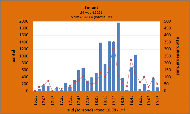 Hoewel de figuur één grote piek laat zien, waren er eigenlijk drie golven van Smienten. De eerst golf bestond voornamelijk uit laagvliegende Smienten vanuit de nabije regio. De tweede golf begon rond zes uur en deze groepen vlogen allen hoog en ver over. De derde golf begon rond kwart voor zeven en kwamen uit een meer westelijke richting en vlogen beduidend lager dan de vogels van de tweede golf. De laatste golf kwam ook wat dichter bij de telpost langs.